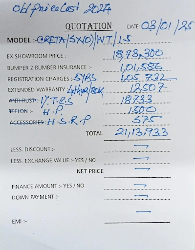 Sain Hyundai has quoted a ₹21,13,933 lakhs price for Hyundai Creta Hyundai Creta SX(O) IVT 1.5 Petrol. They have also added a neat 4-year extended warranty for ₹12,507
